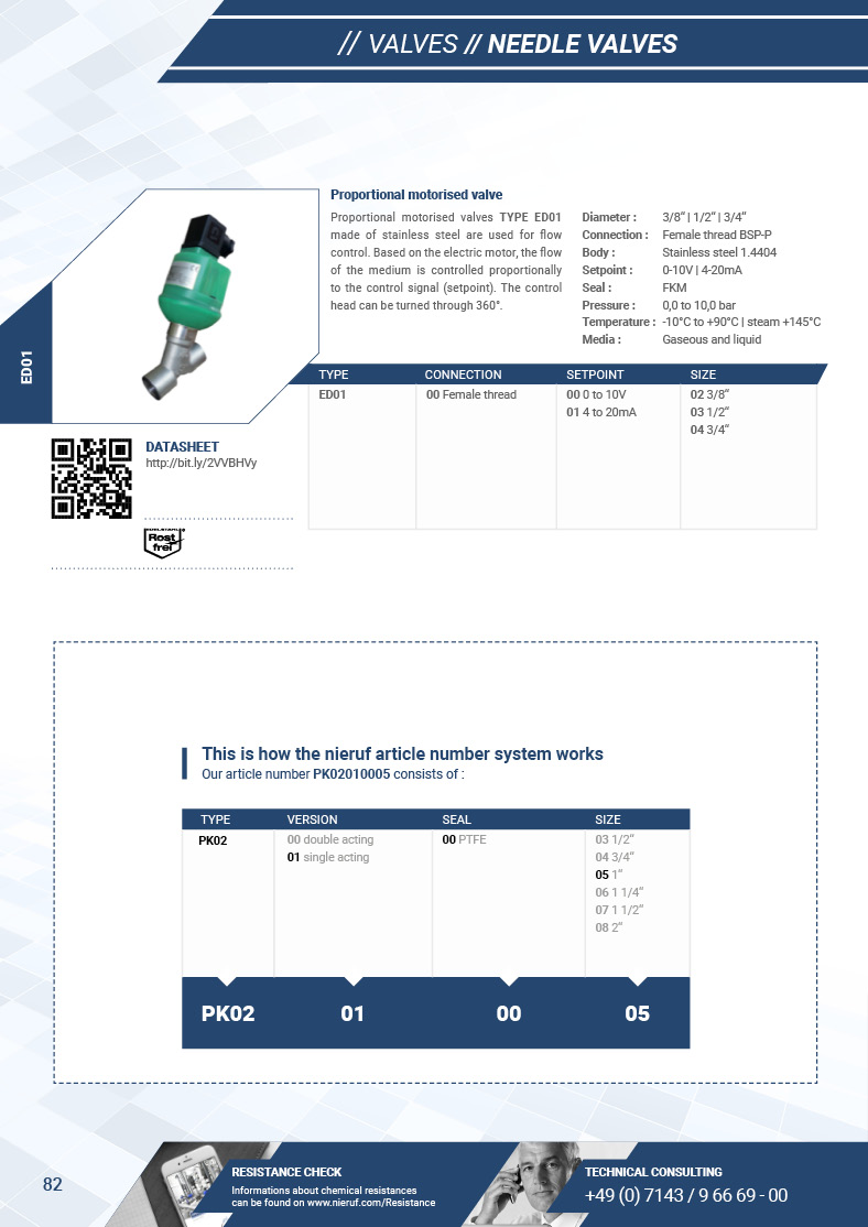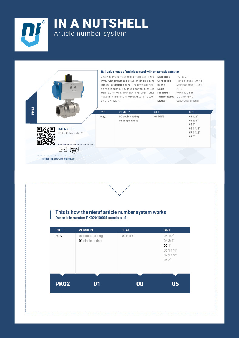 Thanks to our NieRuf part number system, you can read the most important characteristics of the product directly from the part number. It is composed - depending on the fitting or measurement technology - of the various properties such as type, voltage, design, seal, function and size.