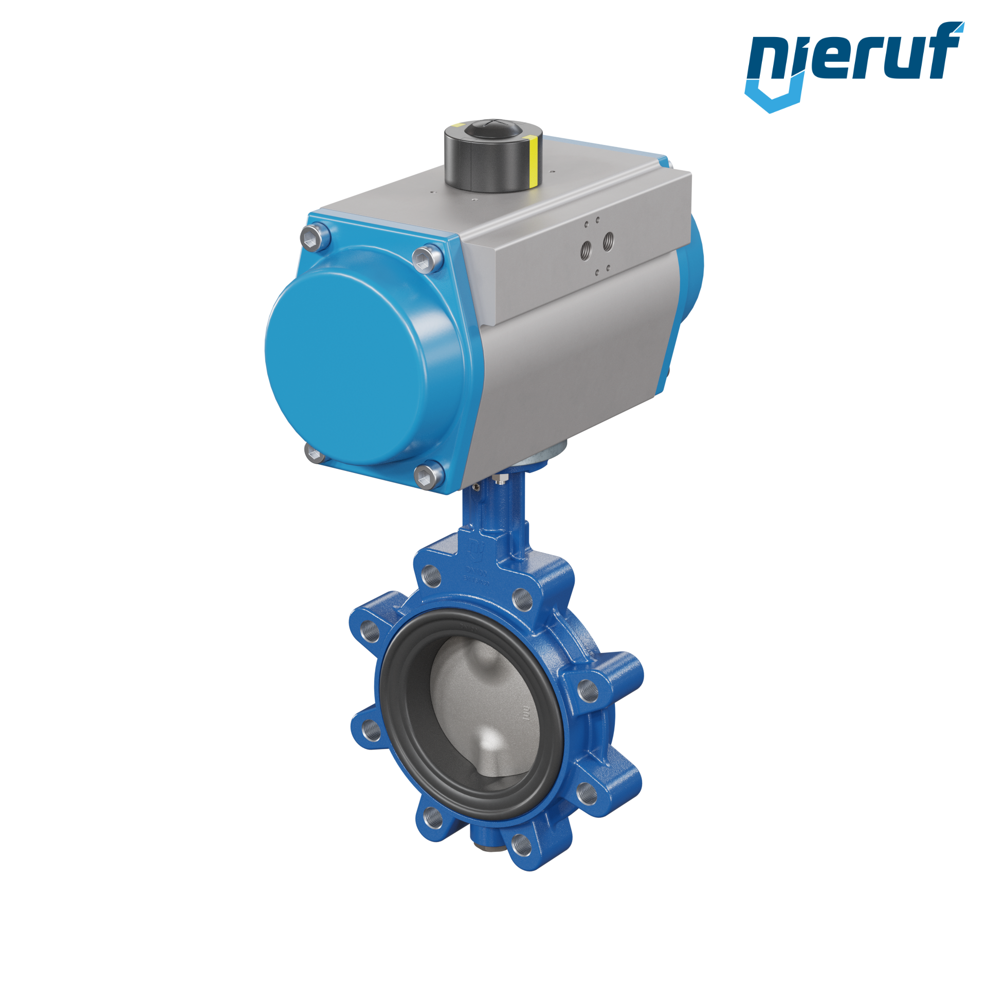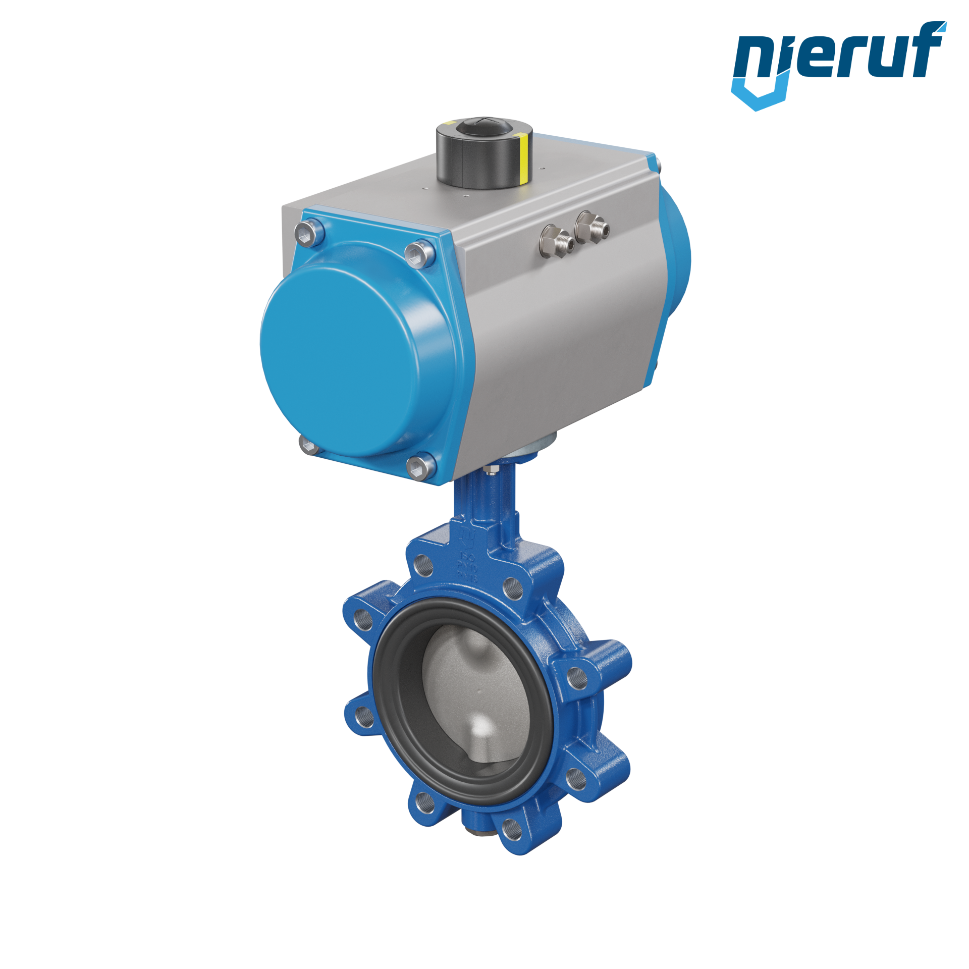 Butterfly valve DN 100 Lug type body made of GGG40 with pneumatic actuator single acting normally closed seal NBR-70-black DVGW gas industry design