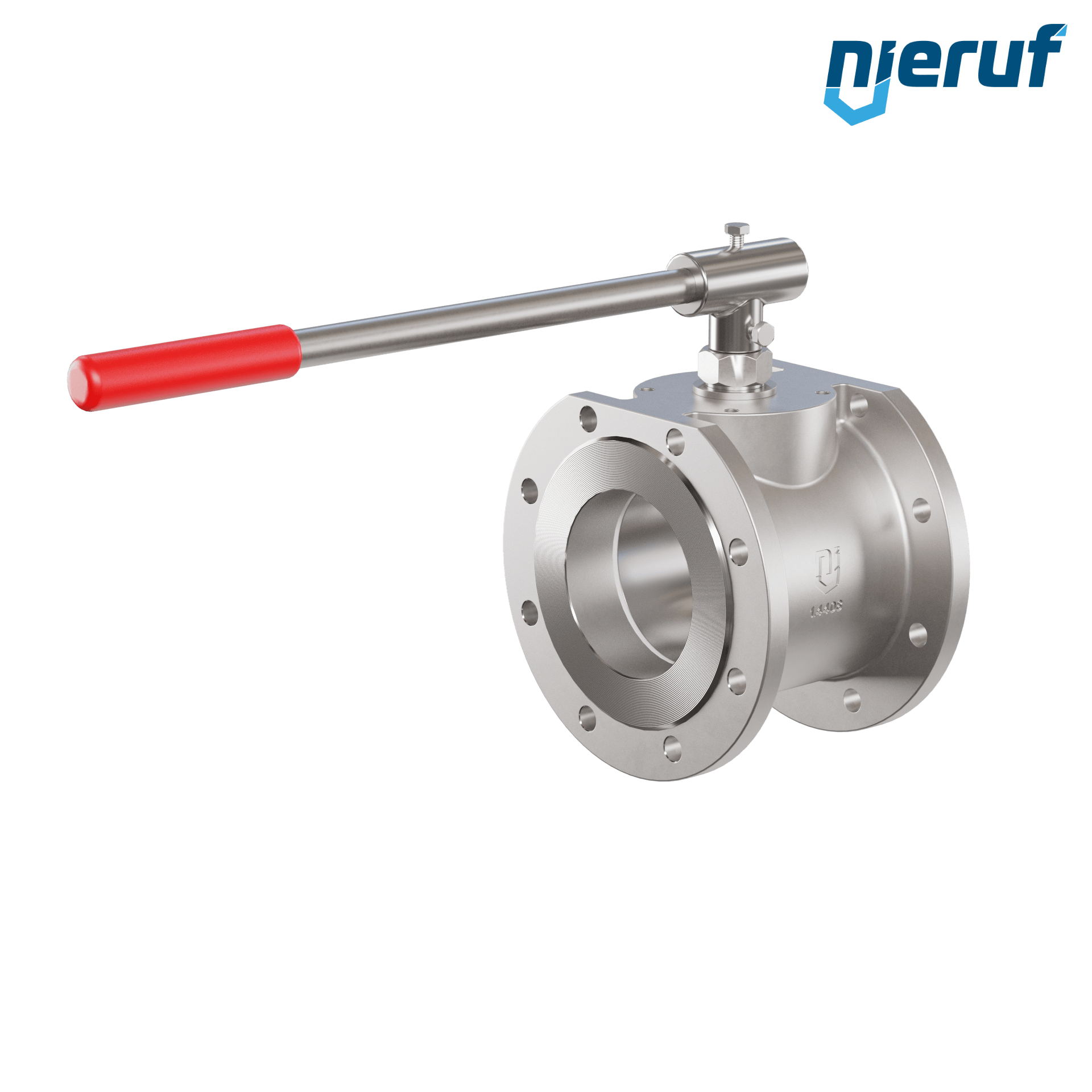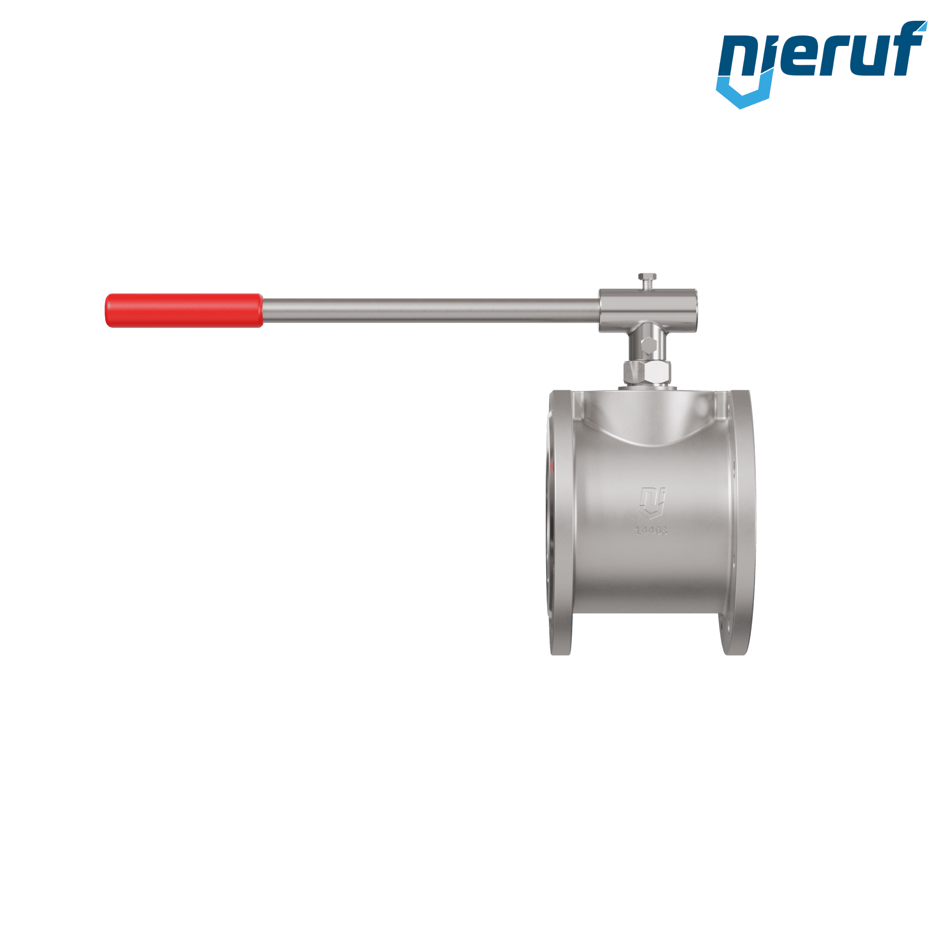 Ball valve in stainless steel with stainless steel handle and ball in compact design. Flanges with metric drilling holes. To shut off pipeline systems.