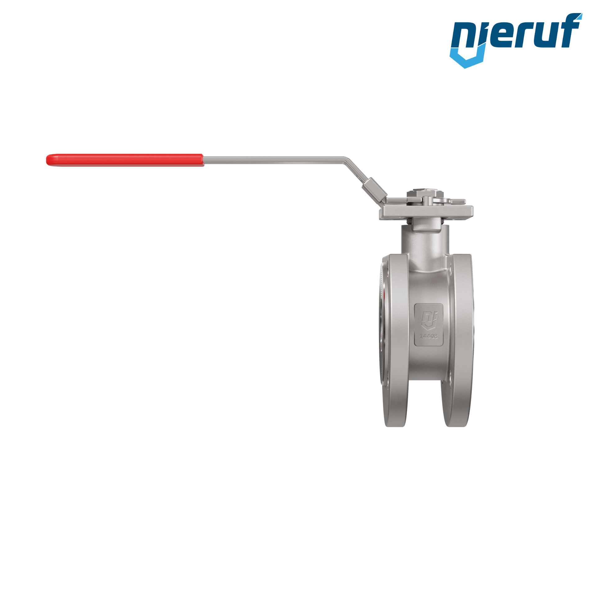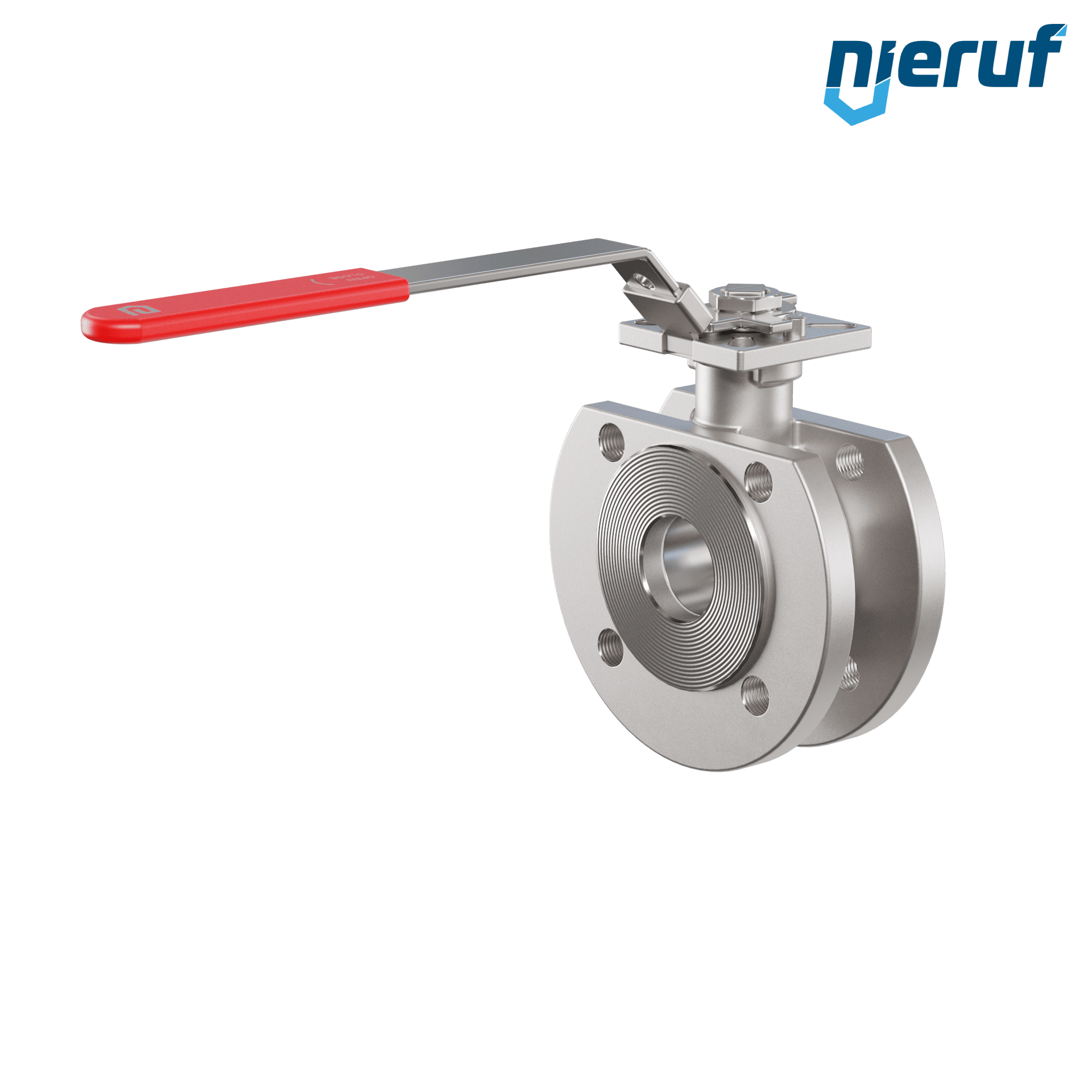 Ball valve in stainless steel with stainless steel handle and ball in compact design. Flanges with metric drilling holes. To shut off pipeline systems.