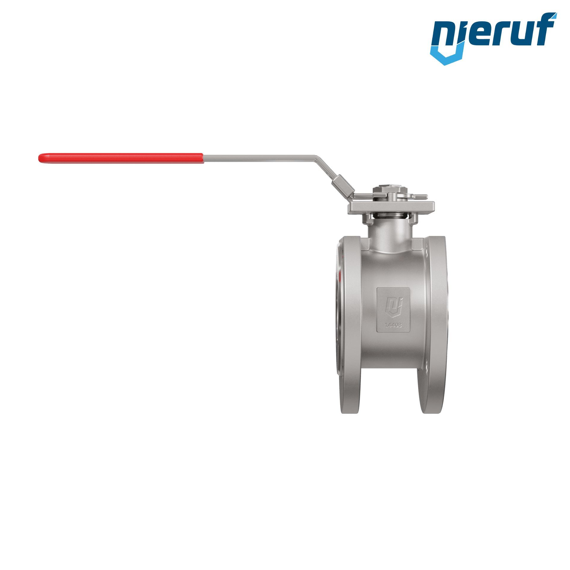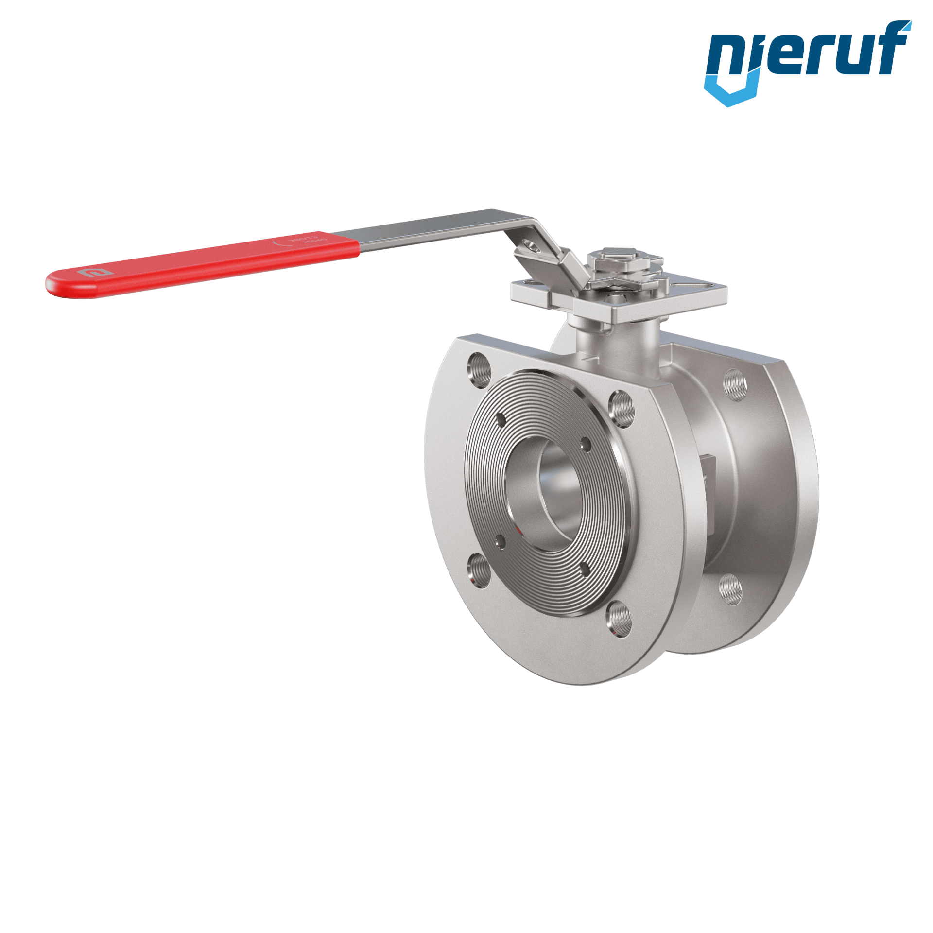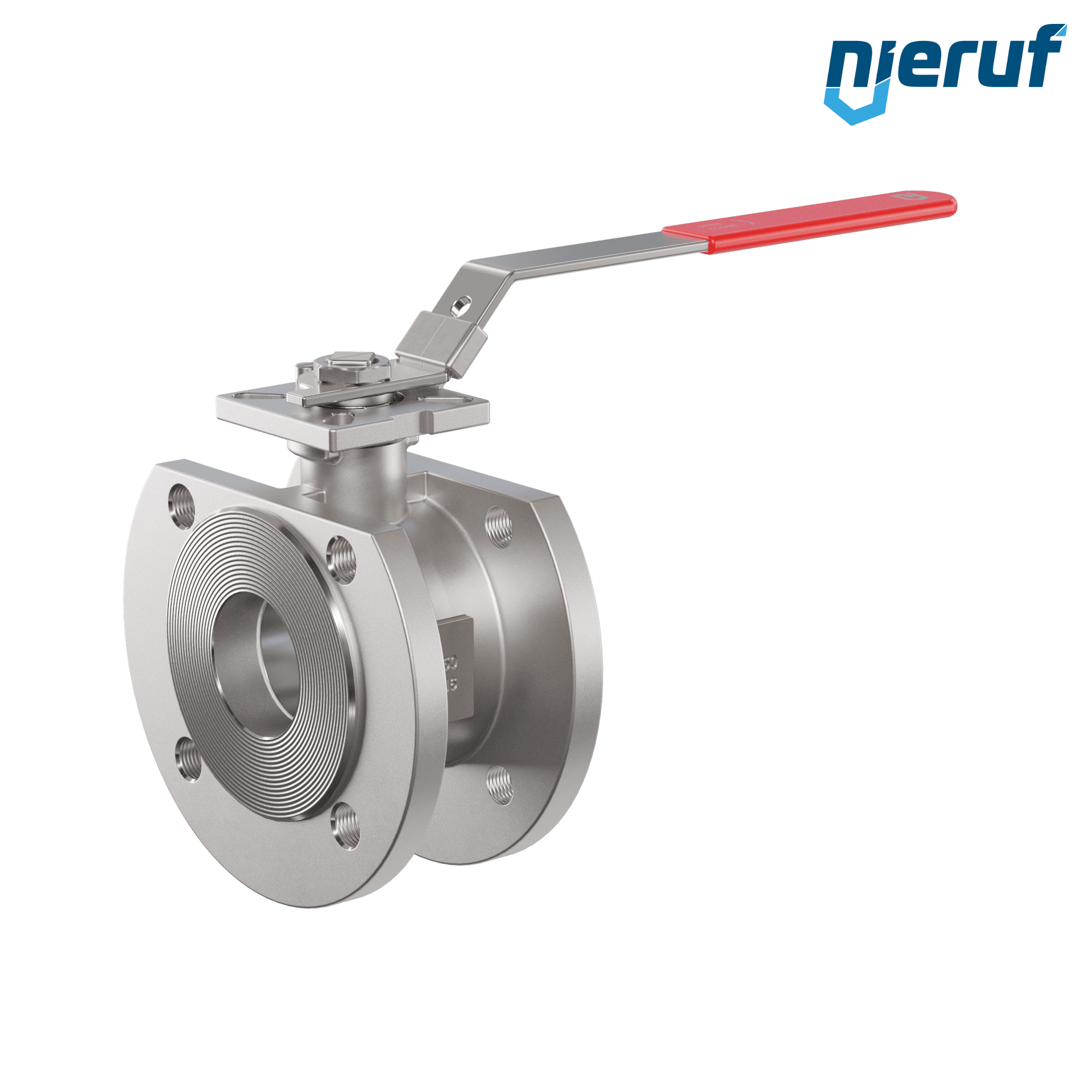 Ball valve in stainless steel with stainless steel handle and ball in compact design. Flanges with metric drilling holes. To shut off pipeline systems.