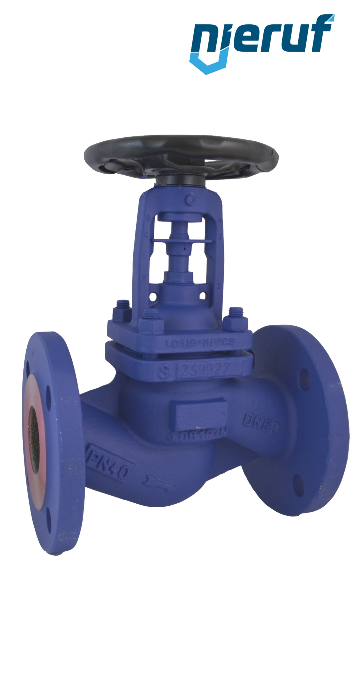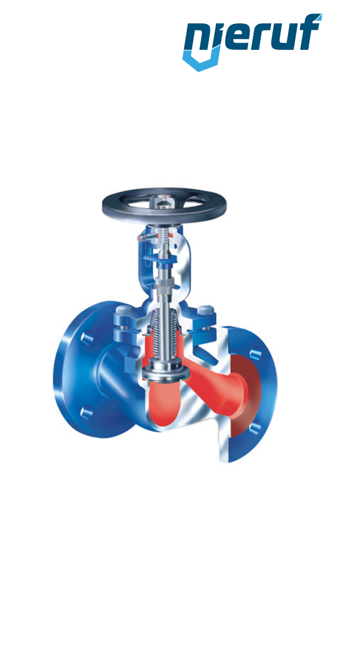 | product feature | Stop valve - straight through with flanges and bellows seal additionally with non-rotation lock, flat lubricating nipple and position indicator as standard - CLOSED / OPEN. At high differential pressures a balancing plug is necessary! |