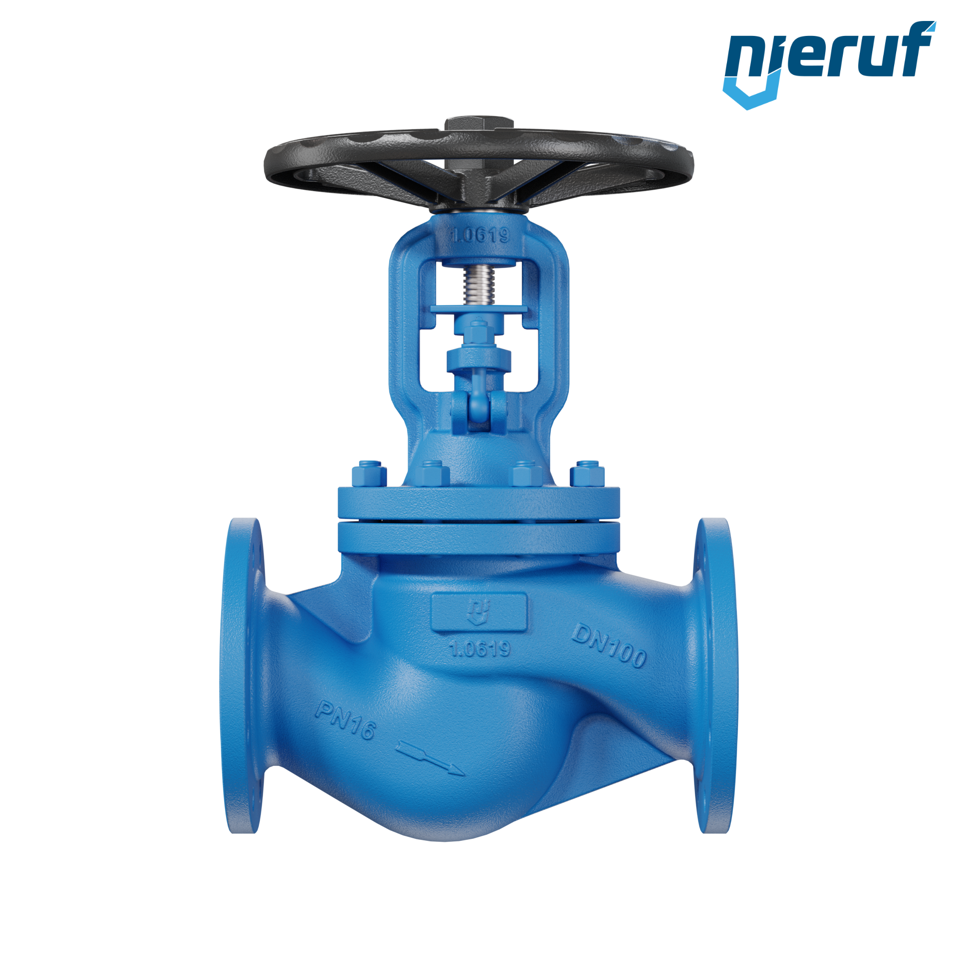 Globe valve AV05 DN100 PN16 throttling cone in straight through with bellow flange acc. DIN EN 1092 material cast steel 1.0619+N