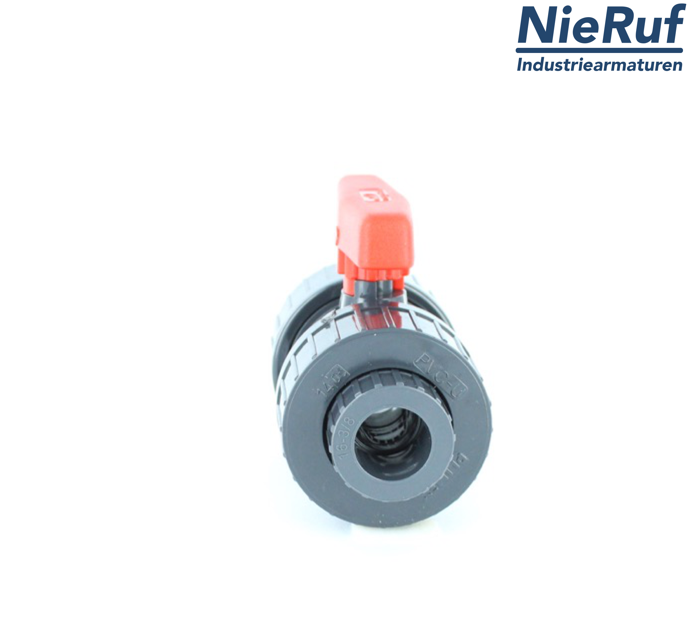 PVC-ball valve with double union and secure ball made of PVC with lever in compact design.