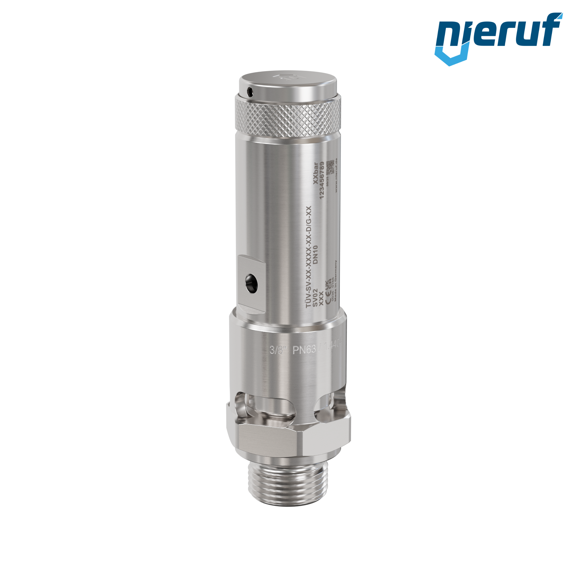 safety valve 3/8" m Typ SV02 atmospheric discharg for air, made of stainless steel with an FKM seal, pressure 0,2 - 25,0 bar- higher pressures possible in PTFE version