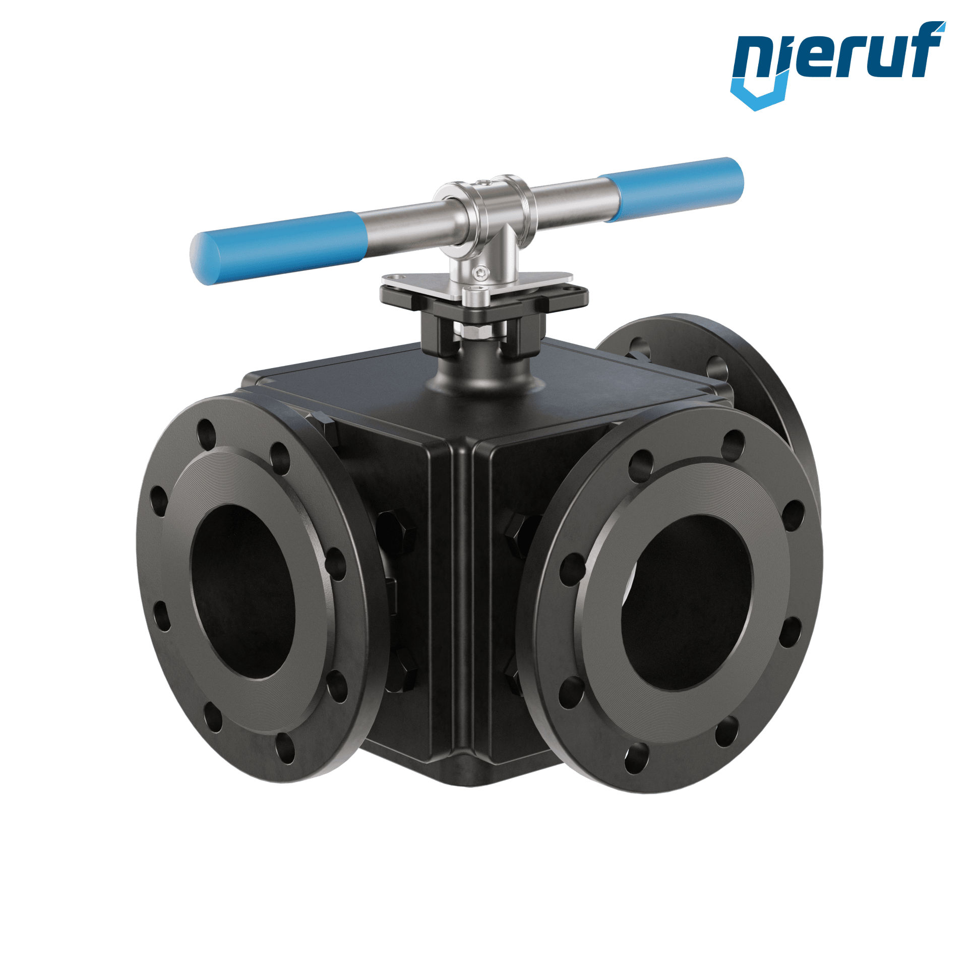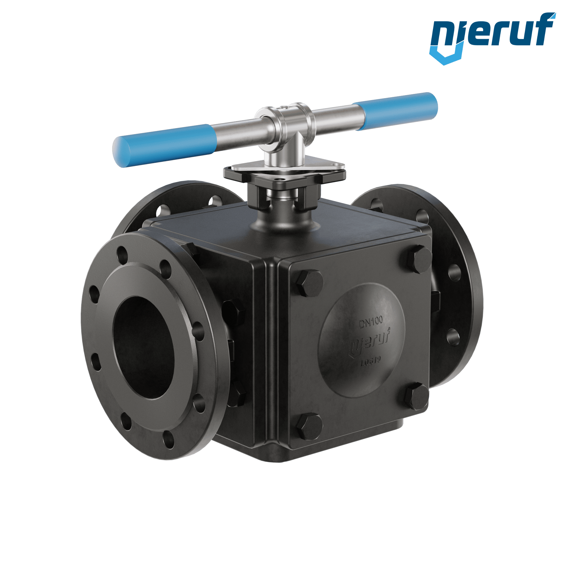 Three-way flange ball valve DN100 PN16 FK08 body carbon steel 1.0619 ball carbon steel 1.4308 seal TFM 1600 / PTFE T drilling