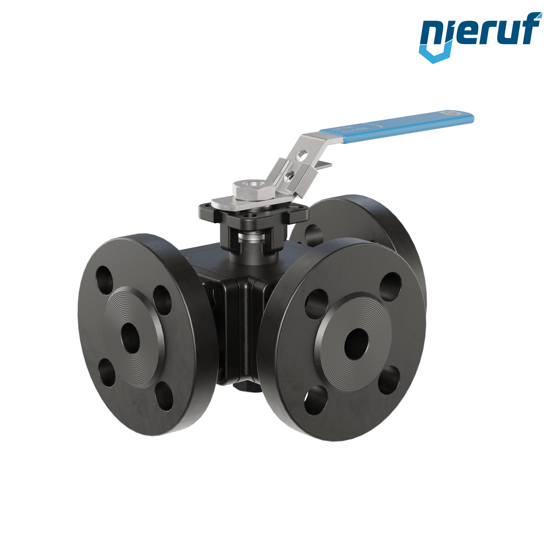 Three-way flange ball valve DN15 PN16/40 FK08 body carbon steel 1.0619 ball carbon steel 1.4308 seal TFM 1600 / PTFE T drilling