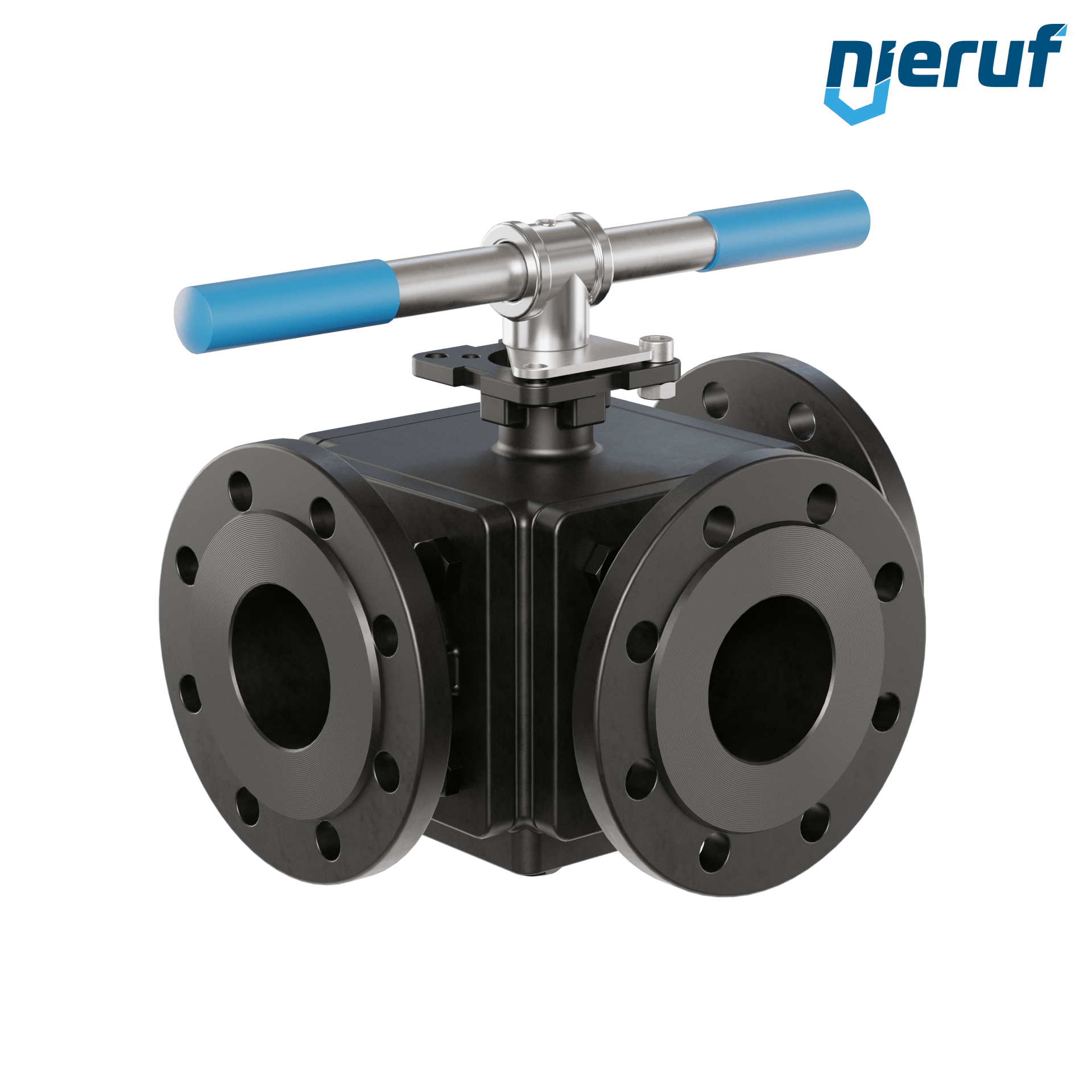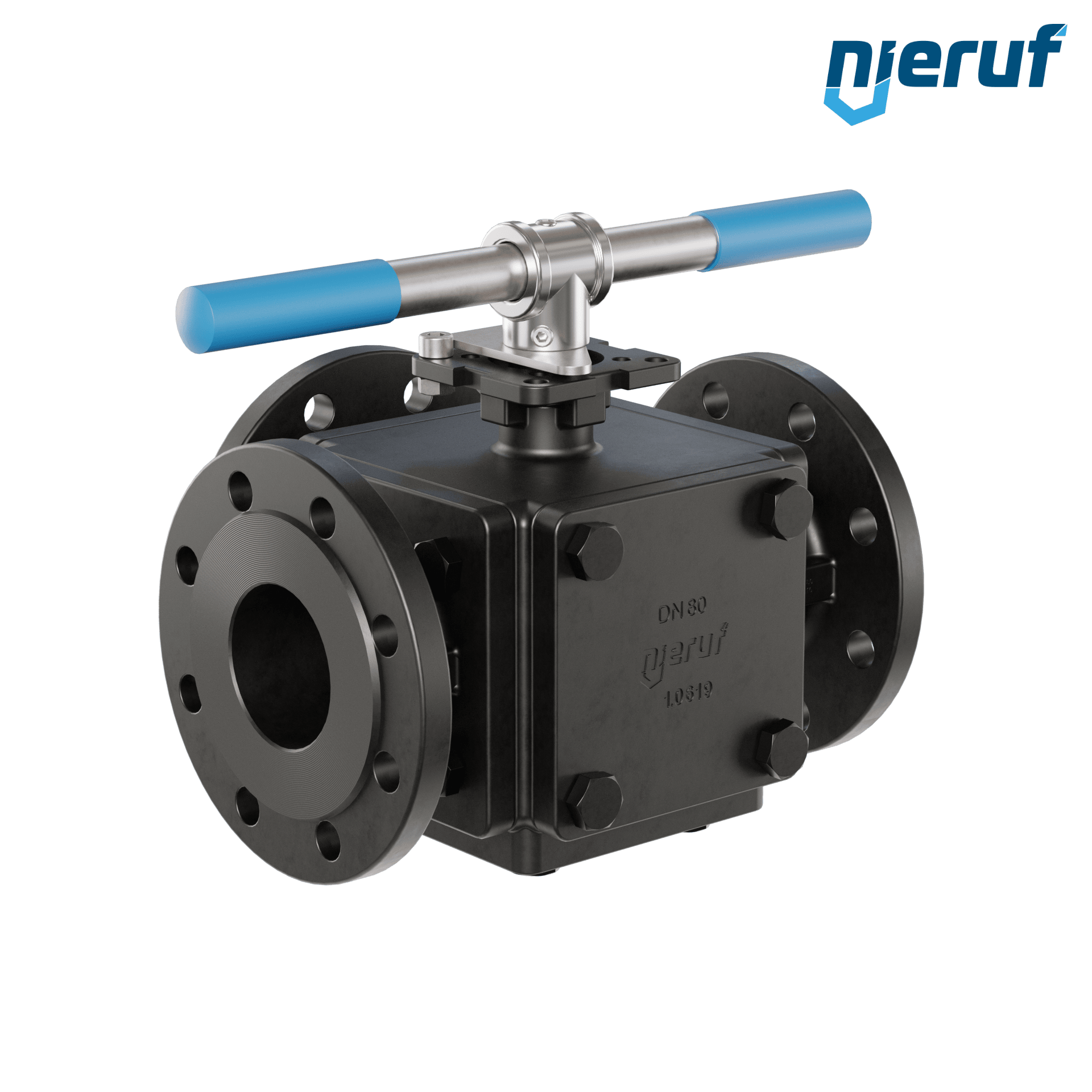 Three-way flange ball valve DN80 PN16 FK08 body carbon steel 1.0619 ball carbon steel 1.4308 seal TFM 1600 / PTFE T drilling
