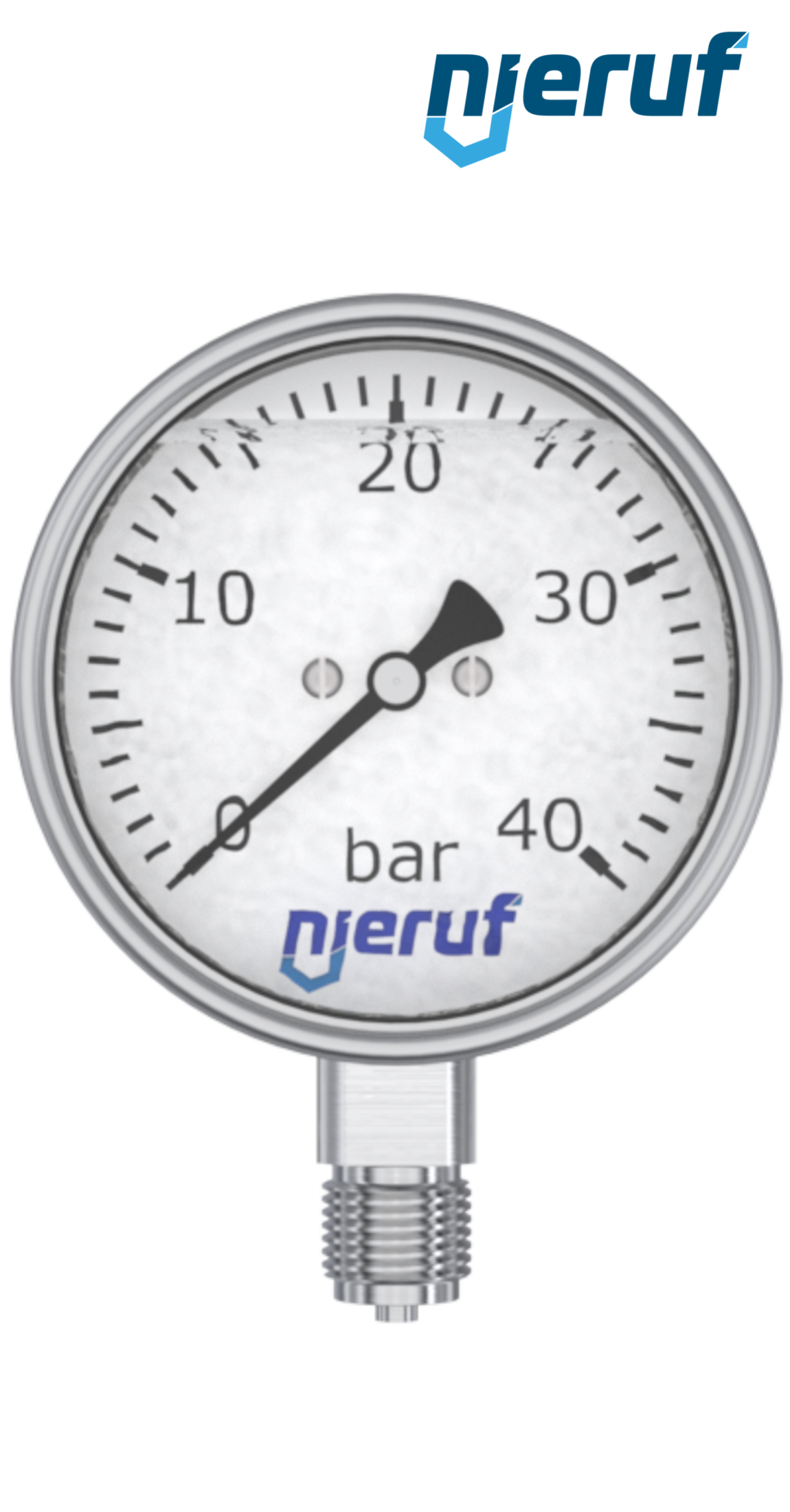 pressure gauge 0 - 1,0 bar G 1/2" glycerin filling diameter: 100 mm stainless steel thread: external thread on downside made of stainless steel