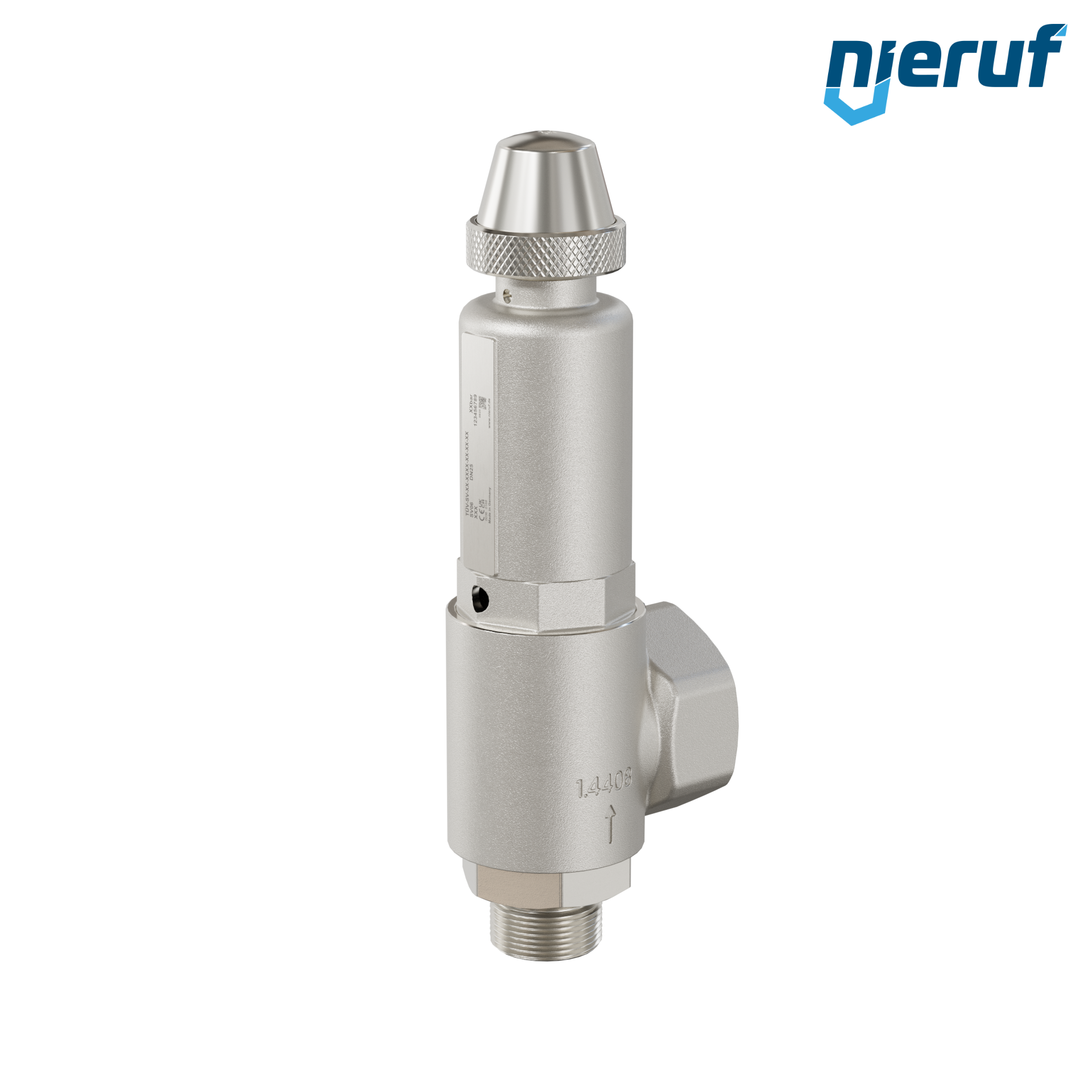 angle-type-safety valve with with bellows for liquid media 1" m x 1 1/2" fm stainless steel Typ SV06 with male screw threaded BSP-P PTFE-seal and twist-type lifting mechanism