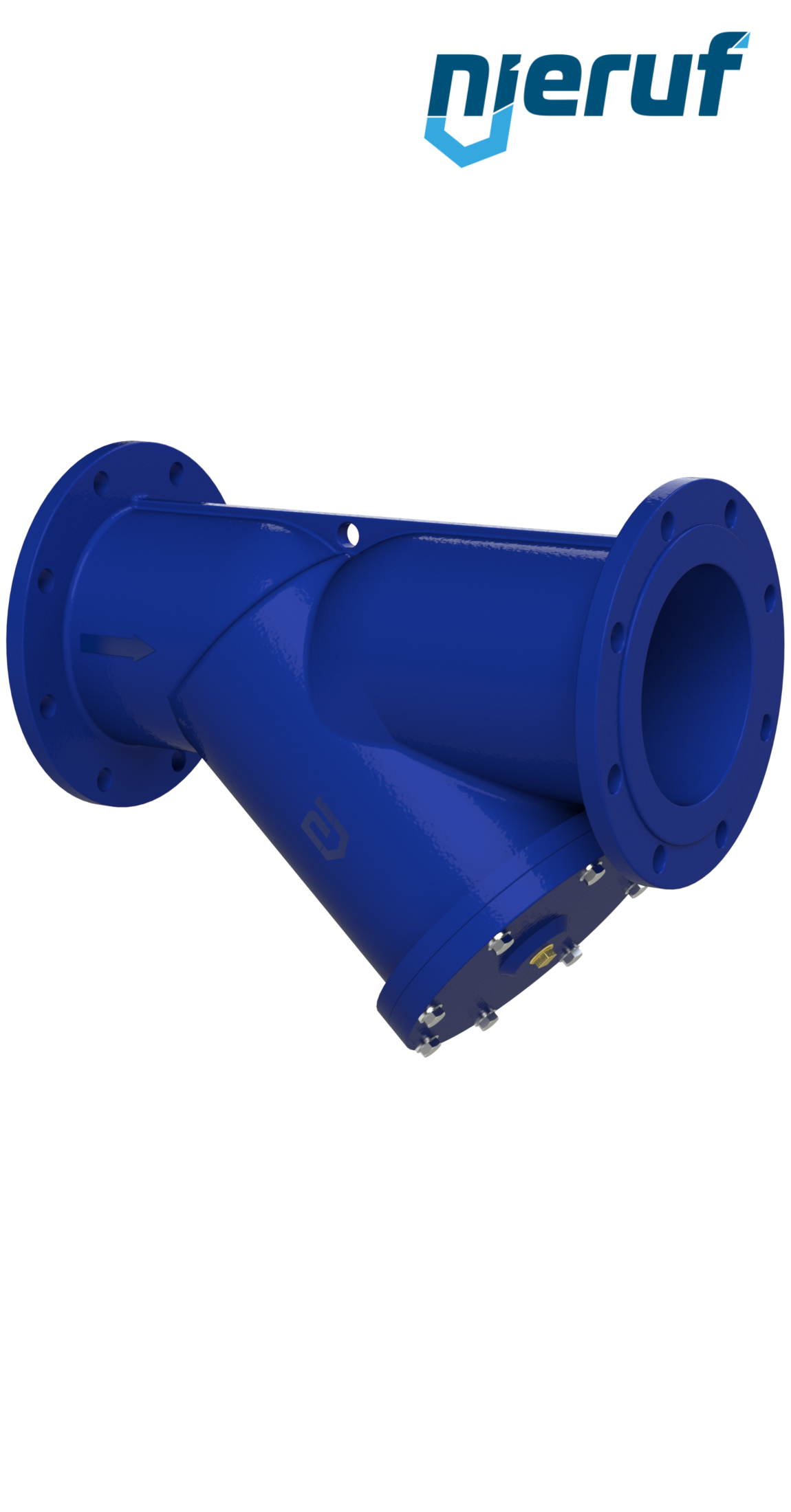 Y-strainer flange made of cast iron with draining cap and removable stainless steel filter, horizontal or vertical position.